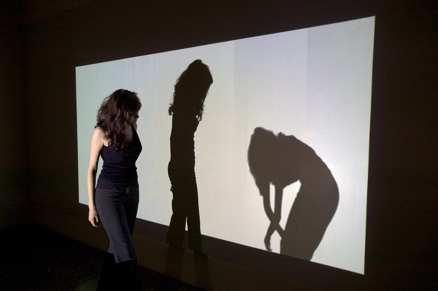 As a viewer walks within the beam of an interactive projection, Shadow Bag captures his shadow and re-projects it onto a screen with unpredictable variation. Sometimes there is no response: the projector acts merely as a light source casting the viewer’s true shadow; sometimes a disembodied copy of the viewer’s shadow comes immediately towards him from the other side; at other times, the shadow follows him, often without his knowledge. The responding shadow might be the viewer’s, and at other times someone who came before. Occasionally when a viewer touches one of these disembodied shadows, it collapses like a corpse. The title of the work refers to Carl Jung’s use of shadow as a psychological term to describe our repressed and unconscious selves.